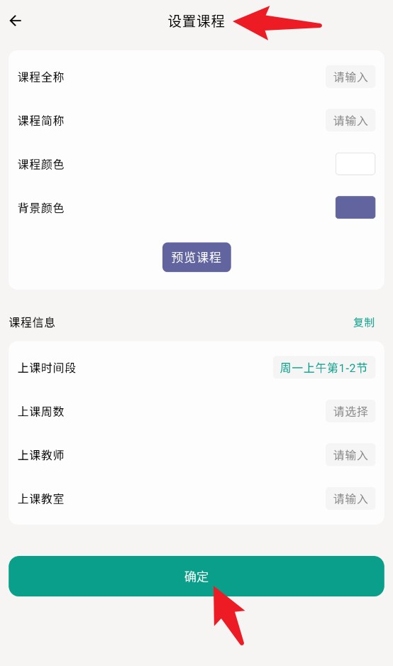 3.点击“设置课程”页面可自定义课程名称、时间、教师等信息,设置完成后点击“确定”保存。