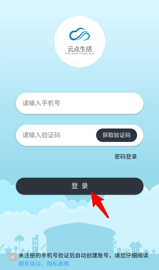 1、打开云点生活App后,输入手机号与验证码,即可完成快捷登录操作,快速进入平台首页。