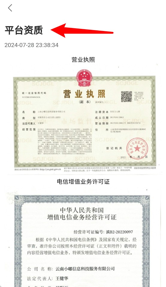3、点击平台资质栏目,可查看营业执照和电信增值业务许可证,保障平台服务正规合法。