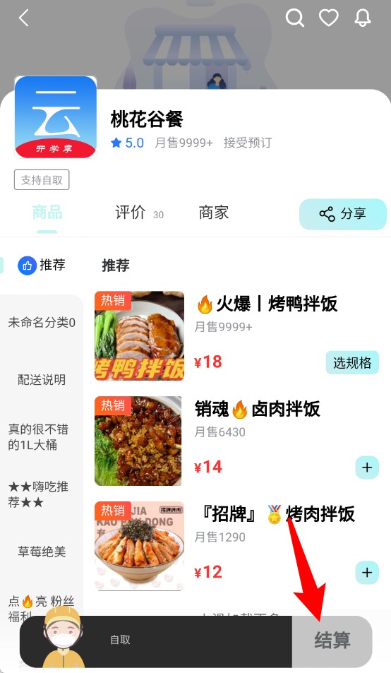 4、在点餐页面选择喜欢的美食后,点击右下角的“结算”按钮,进入下单支付流程。