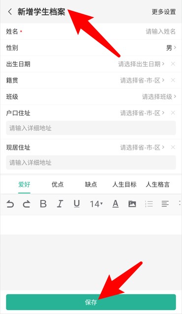 4、新增学生档案页面填写完整信息后点击保存,即可生成新建记录并同步系统。
