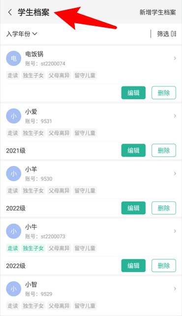 5、学生档案模块展示所有学生资料,支持按入学年份筛选并进行编辑与删除操作。