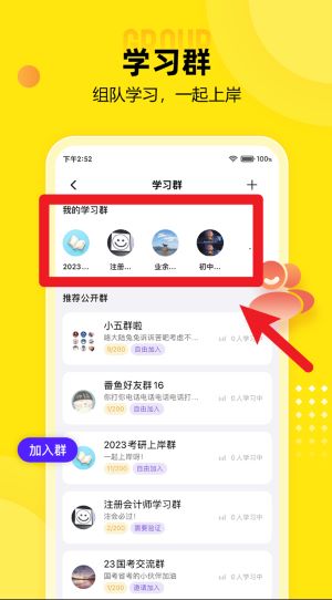 4、点击进入“学习群”功能页面后,可查看已加入的学习群,也可以在下方选择推荐群组点击“自由加入”,与其他同学组队学习。
