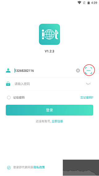1、打开之后点击账户右侧的二维码扫描框图标对设备条码进行扫描