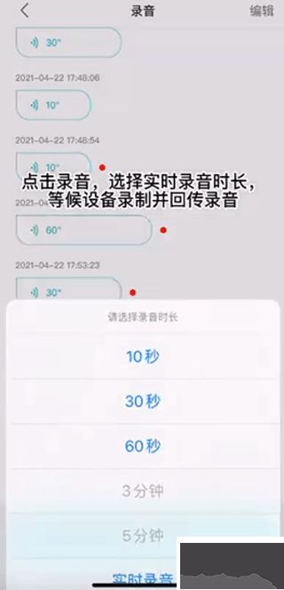 2、点击开始录音,选择实时录音时长,等候设备录制并回传录音,手机就会自动保存对应的录音文件,点击录音文件就可以对远近录音进行相应的编辑操作。