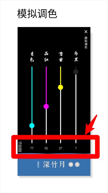 4、模拟调色功能提供滑竿调节方式,直观混合青色、品红等色阶形成目标色。