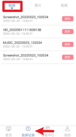 2、在“投屏记录”界面可查看已投过的所有视频、图片和音频文件,支持一键删除不需要的历史记录内容。