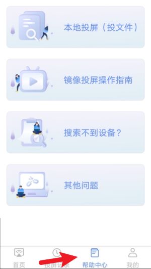 3、进入“帮助中心”后可查看本地文件投屏方式、镜像投屏步骤,以及搜索不到设备等常见问题解决方法。
