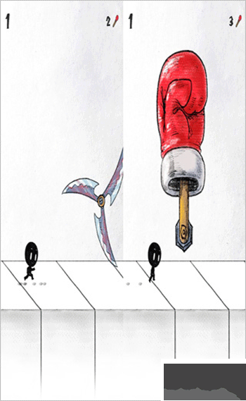 刀片:火柴人跑至下方时快速点击屏幕两下减速,或凭运气直接跑过(概率低);
