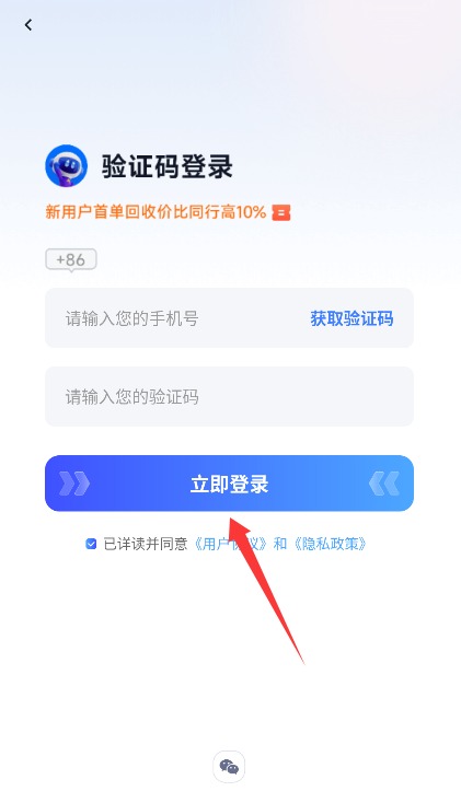 2、输入手机号获取验证短信,填写验证码并勾选协议后点击"立即登录"完成认证。
