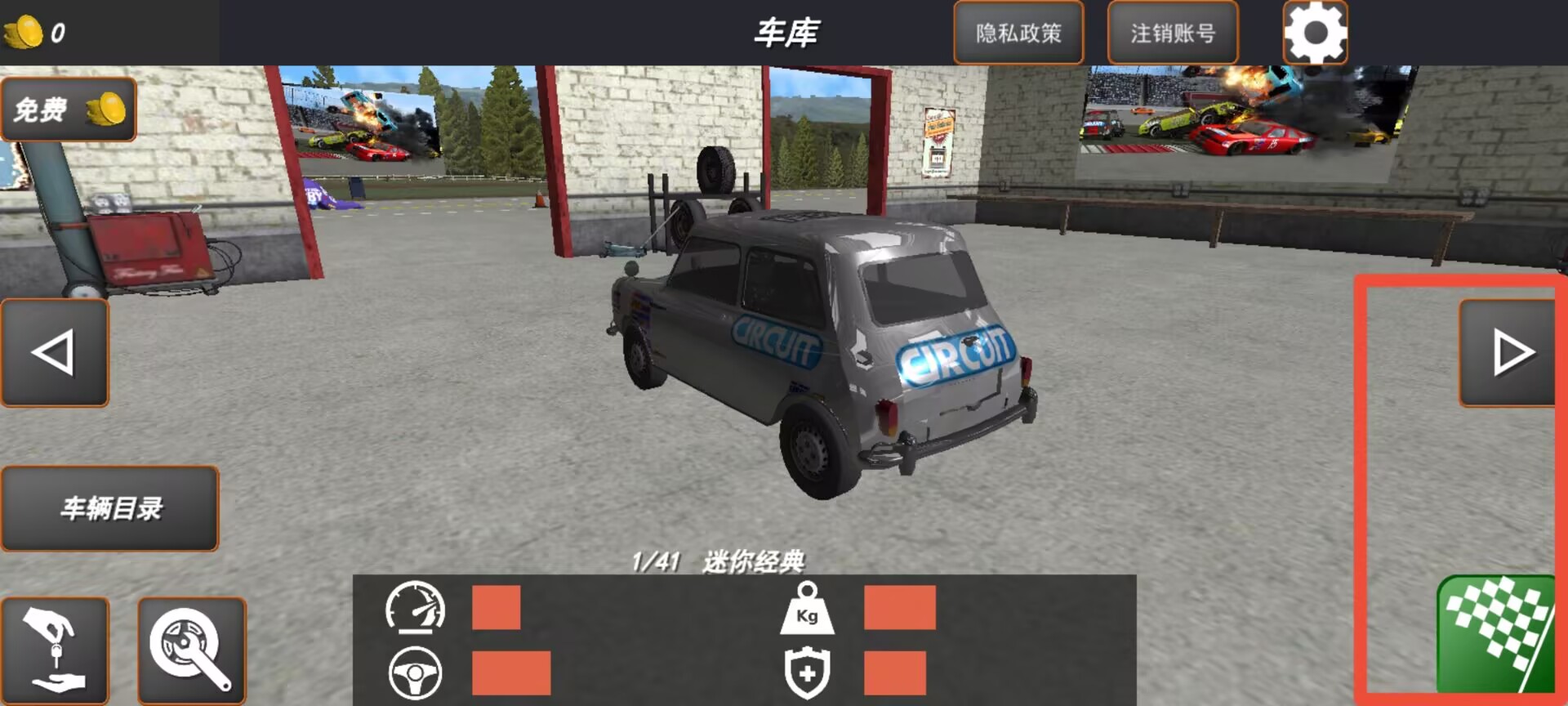 1、完成账号登录后进入车辆选择界面,通过切换功能浏览可用车型,左下角目录图标可查看完整车辆列表。
