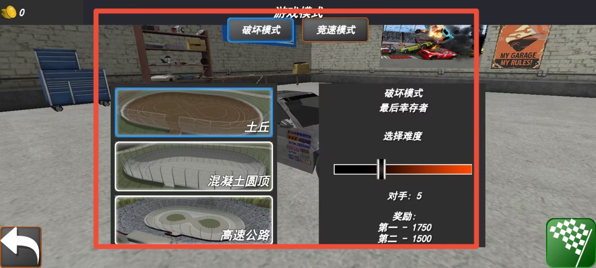 2、模式选择界面提供破坏与竞速两种玩法,右侧标注参赛人数及关卡奖励信息,选定难度后确认开始比赛。