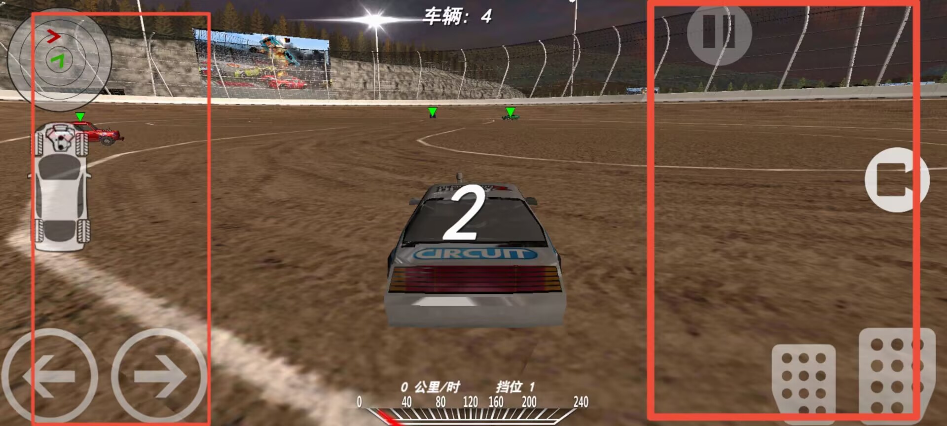 3、比赛界面左侧显示赛道地图与方向控制,顶部记录剩余车辆数,底部为速度仪表,右侧分布功能按键与油门刹车。
