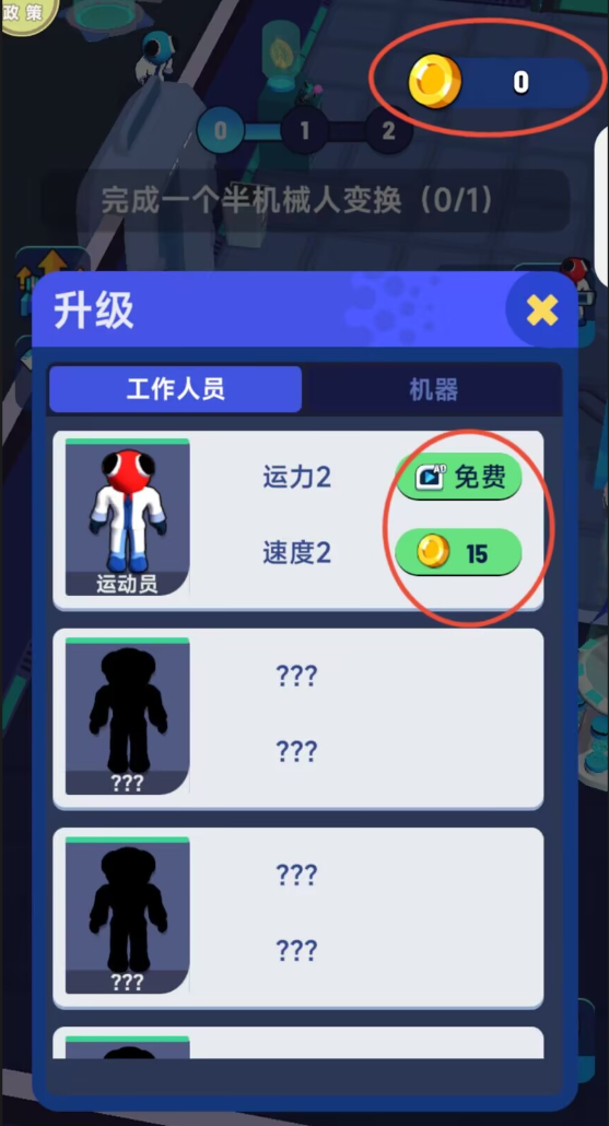 2、界面右上方实时显示当前资金数额,点击扩展菜单可进入强化界面,使用金币提升设备与雇员的工作效能。