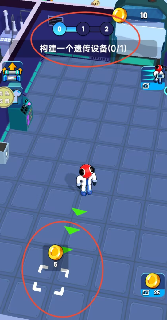 3、游戏采用自动运行机制,顶部进度条与指引提示将明确当前任务目标,到达指定建造区域后系统自动扣除金币完成建设。