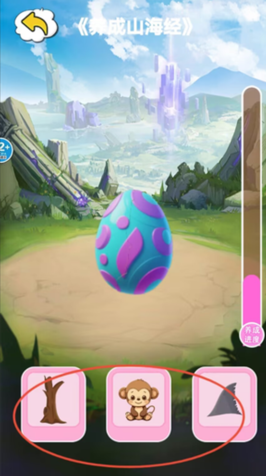 2、选择山海经养成模式后,先挑选初始宠物蛋,再为其选定合适栖息环境,通过点击底部按钮填满右侧进化条。