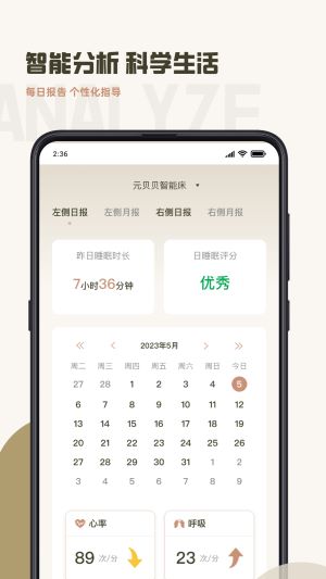5、每日可查看宝宝的睡眠分析报告,系统会汇总评分、心率、呼吸等指标,科学指导育儿生活。