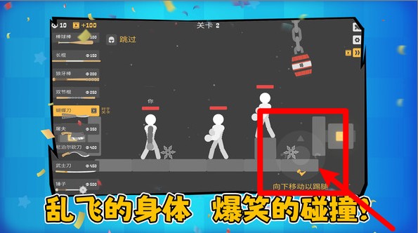3.下滑踢腿操作:跟随提示向下滑动屏幕可发动踢腿攻击,用脚将敌人踹飞造成强力打击效果。