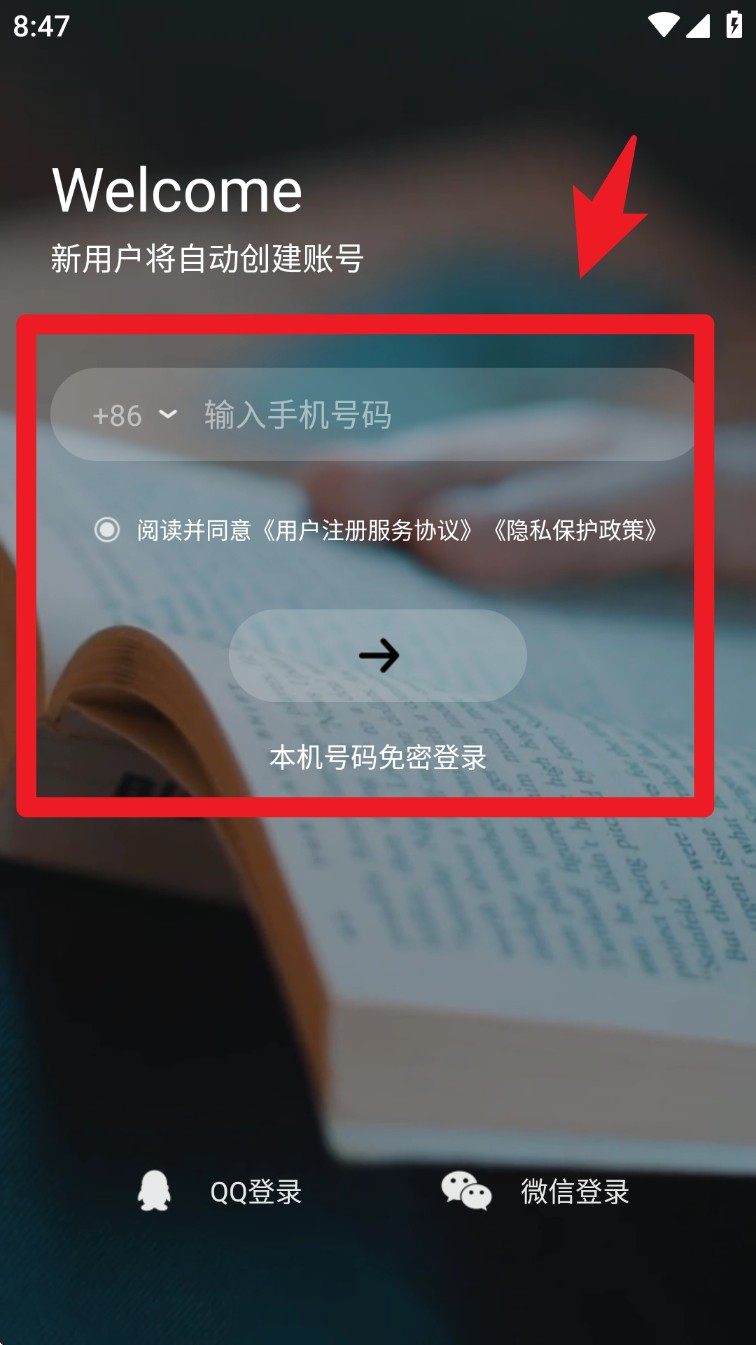 1. 打开App后进入欢迎页,输入手机号并勾选用户协议与隐私政策,同意后点击箭头按钮,即可完成注册并自动登录系统。