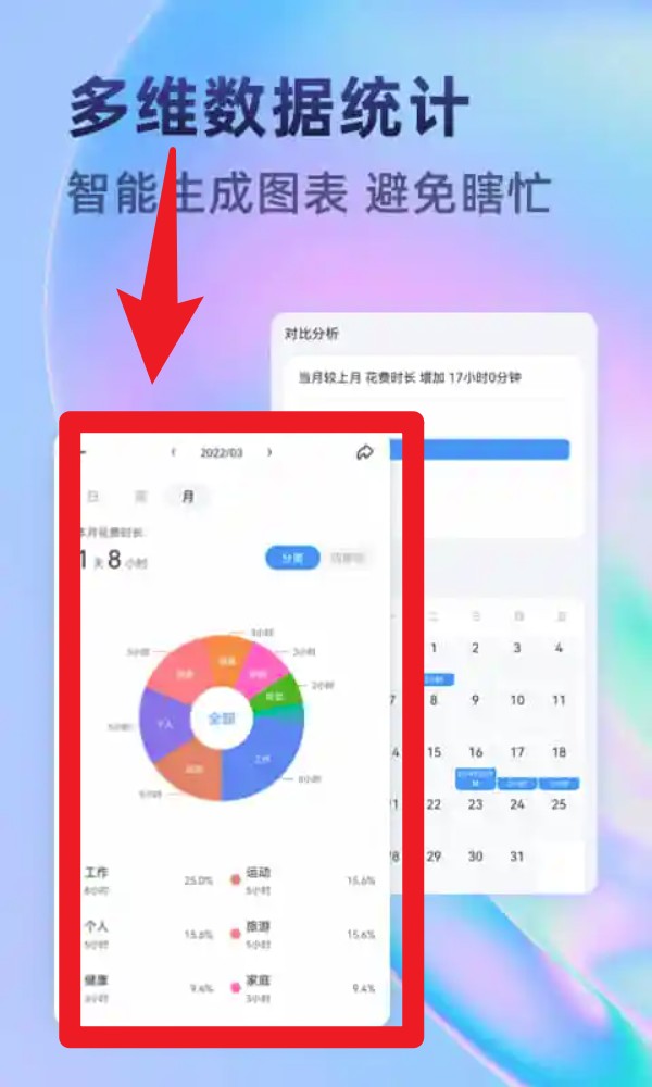 5. 点击“统计”功能可查看多维度数据图表,系统会自动生成分类环形图,帮助你复盘时间分布,优化日常安排。
