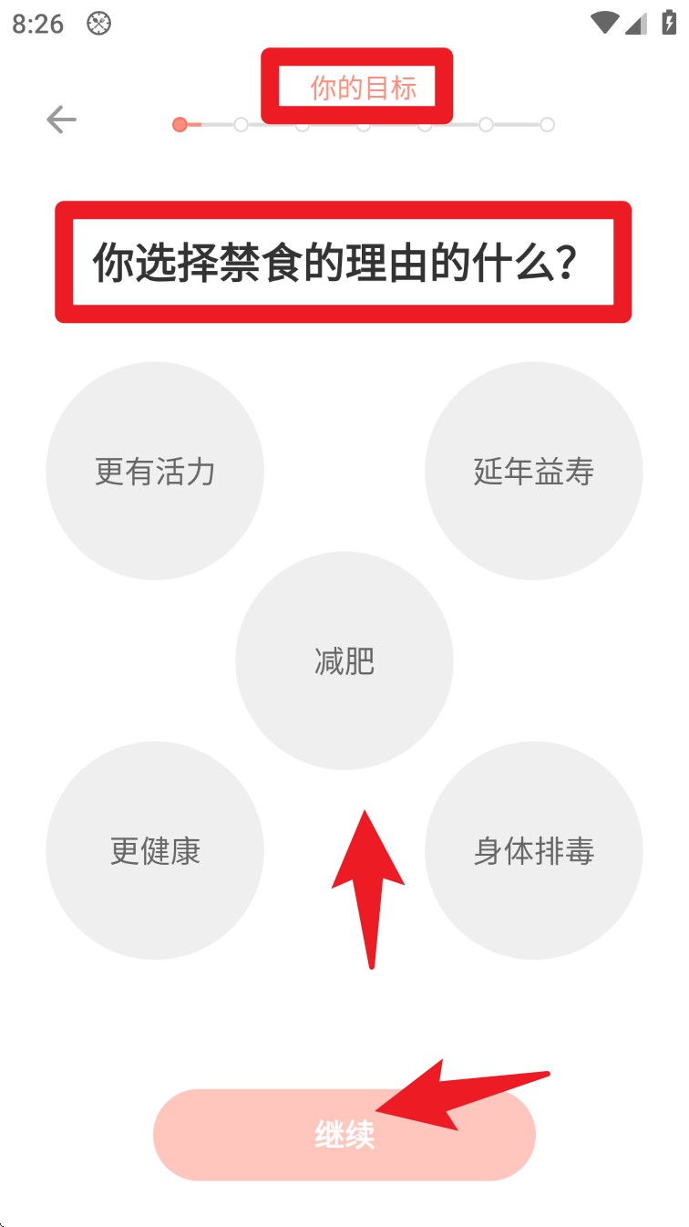 1. 打开App后,进入“你的目标”页面,选择你设定断食的原因,例如减肥、健康等,点选后点击底部“继续”进入下一步设置。