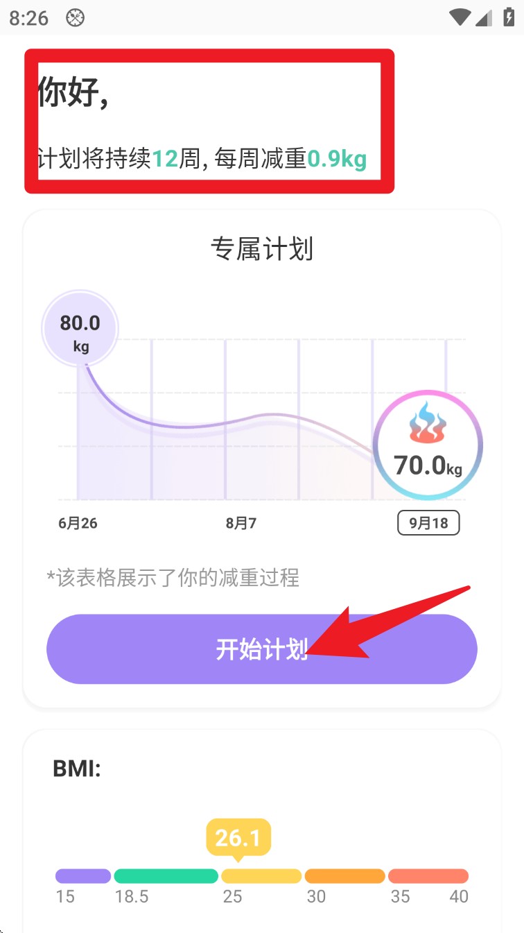 2. 系统会根据目标生成一份专属计划,展示你的体重变化趋势与减重进度,点击“开始计划”后即可正式开启追踪。