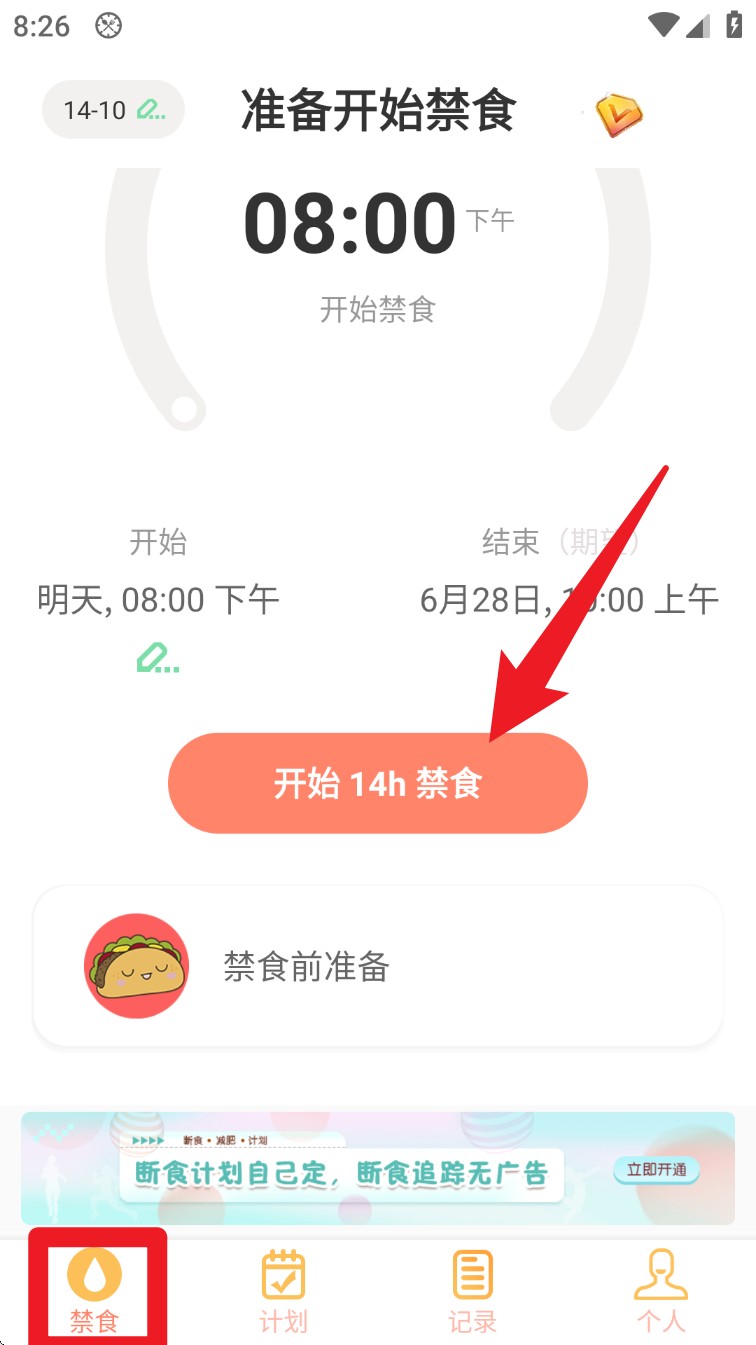 3. 进入“禁食”页面可看到当前断食模式及倒计时信息,点击“开始xx小时禁食”即可正式开始断食周期。