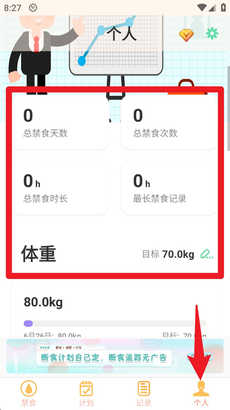 5. 在“个人”页面中可查看累计禁食天数、时长与体重趋势,方便你复盘进度与持续追踪健康状态。