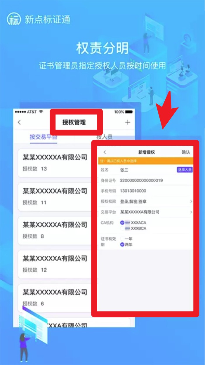 3. 进入授权管理页面,管理员可按需新增授权人,设置证书用途与有效期,支持多企业灵活操作。