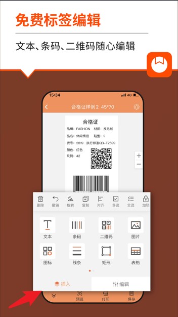 2、编辑页面可插入文本、条码、二维码等元素,操作界面清晰直观,满足多样化标签设计需求。