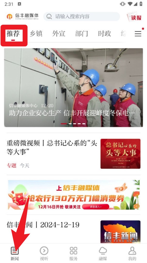 1. 打开信丰融媒体首页后,点击下方导航栏中的“新闻”标签,即可浏览推荐新闻与各类时政内容。