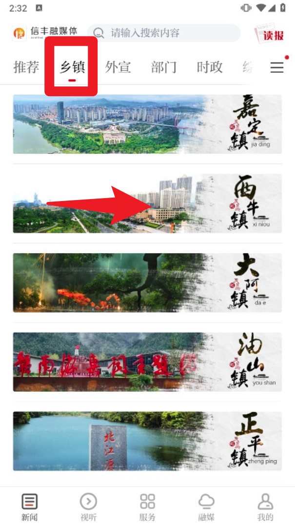 2. 在上方栏目中选择“乡镇”,进入后点选对应区域,如“西牛镇”,查看该地区的本地资讯与宣传信息。