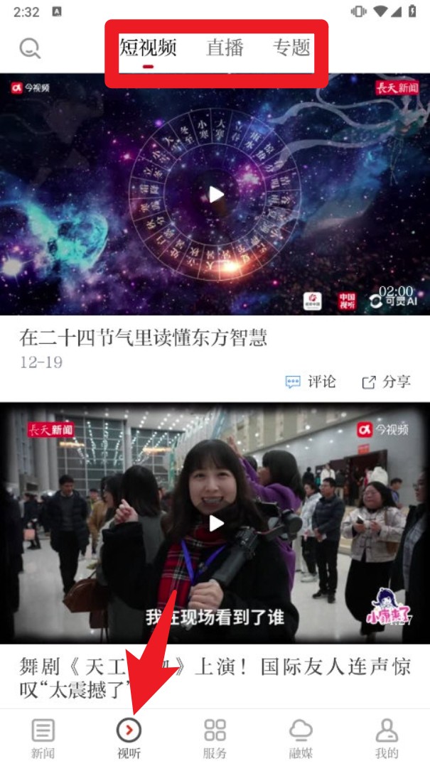 3. 切换到“视听”页签,可浏览短视频、直播与专题内容,了解本地动态及特色节目。
