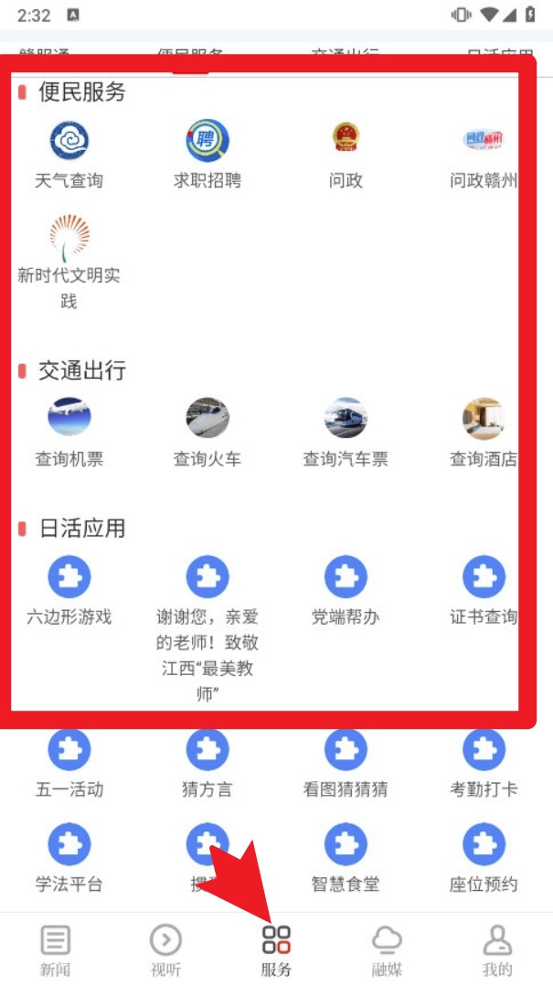 4. 点击底部“服务”按钮,进入后可查天气、火车票、酒店及政务办理等便民功能,操作便捷。