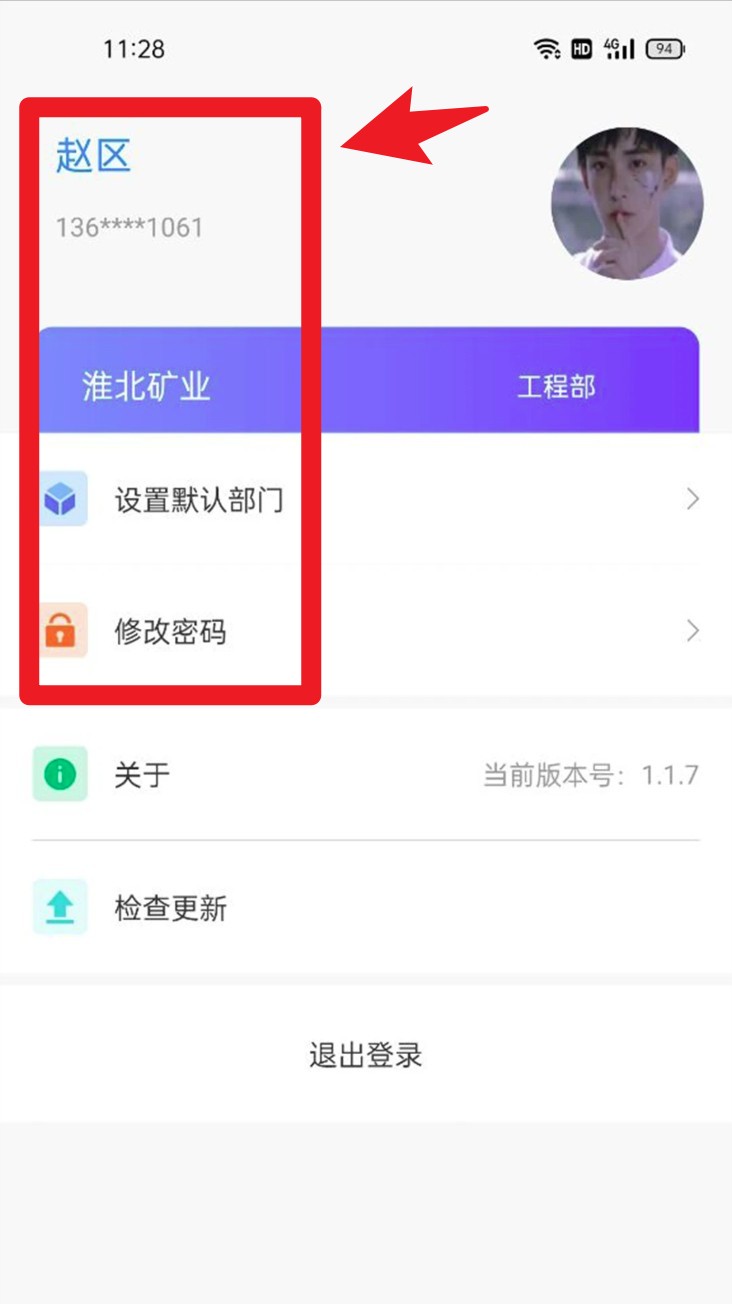4. 进入“个人中心”页面,可查看当前账号信息,支持修改密码、设置默认部门和检查 App 更新。