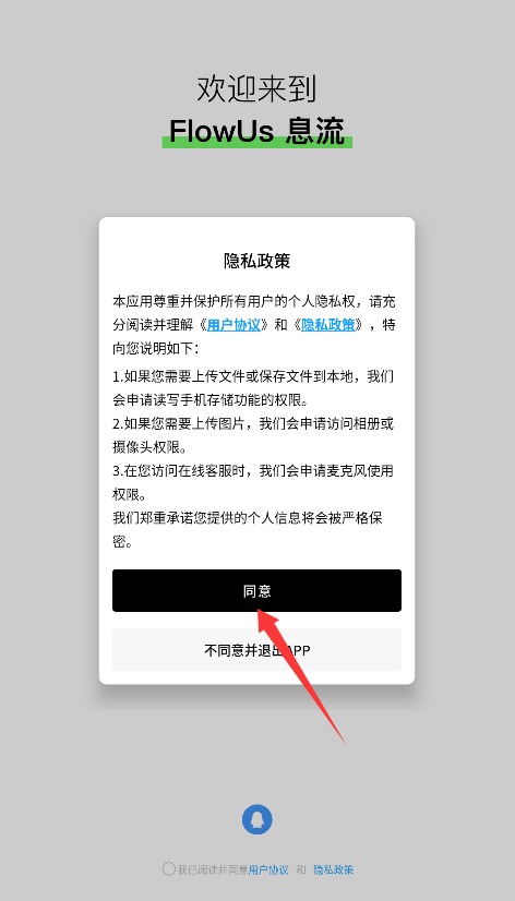 1、初次使用需阅读平台服务条款与隐私政策,确认后点击同意按钮进入应用。