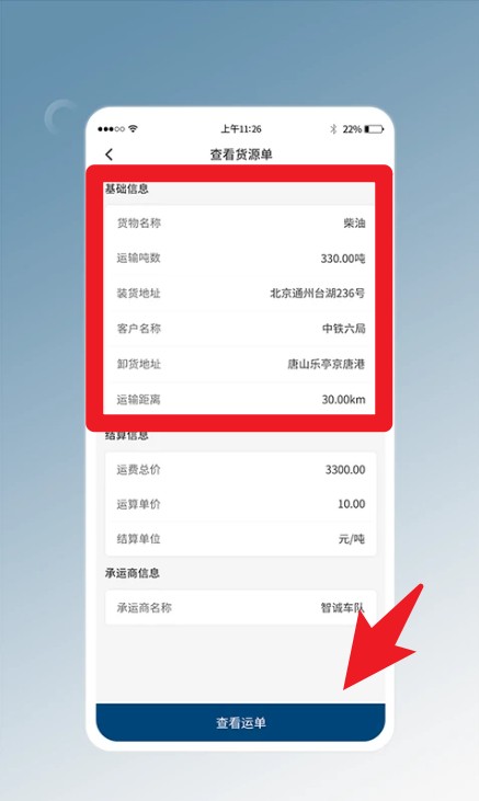 1. 点击首页任务卡片可查看具体运单信息,包括货物名称、装卸地址、客户名称与运输里程,确保出车前清晰了解运输需求与路线安排。
