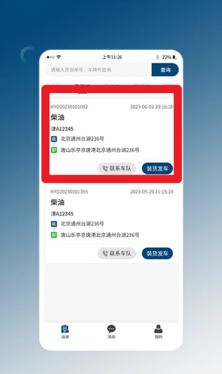 2. 进入运单列表后,点击“装货发车”可启动任务流程,系统支持一键联系车队和实时更新任务状态,方便调度人员同步跟进。