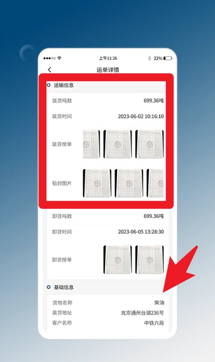 3. 运单详情页面支持上传装货单、铅封图片与卸货凭证,全程拍照存档,确保运输轨迹可查、凭证齐全,满足合规与对账需求。
