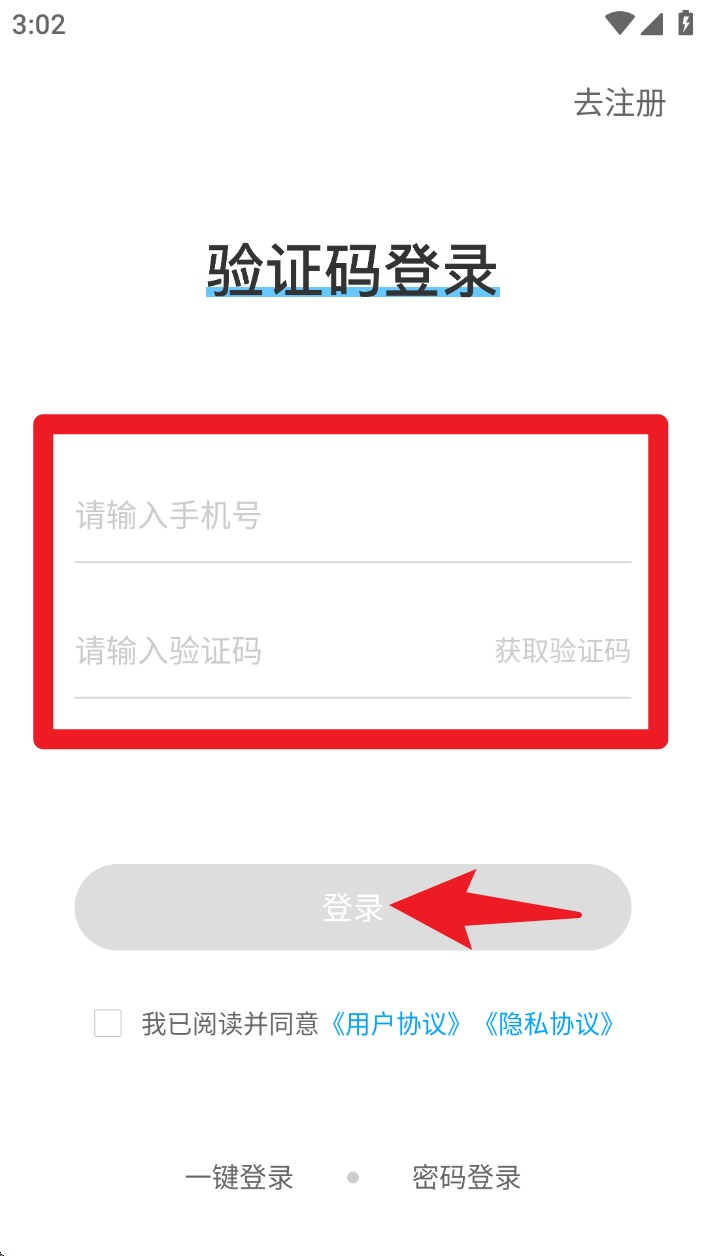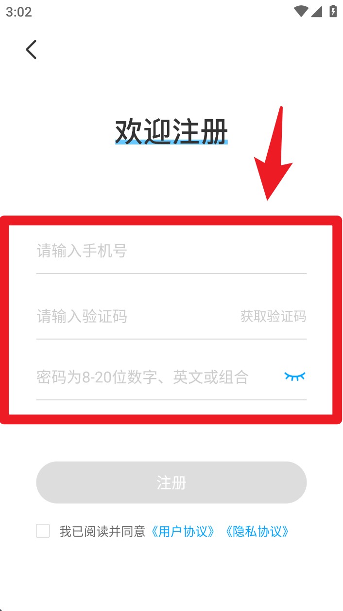 1. 打开 App 进入注册页,输入手机号、验证码及密码并勾选协议,点击下方“注册”按钮完成创建。