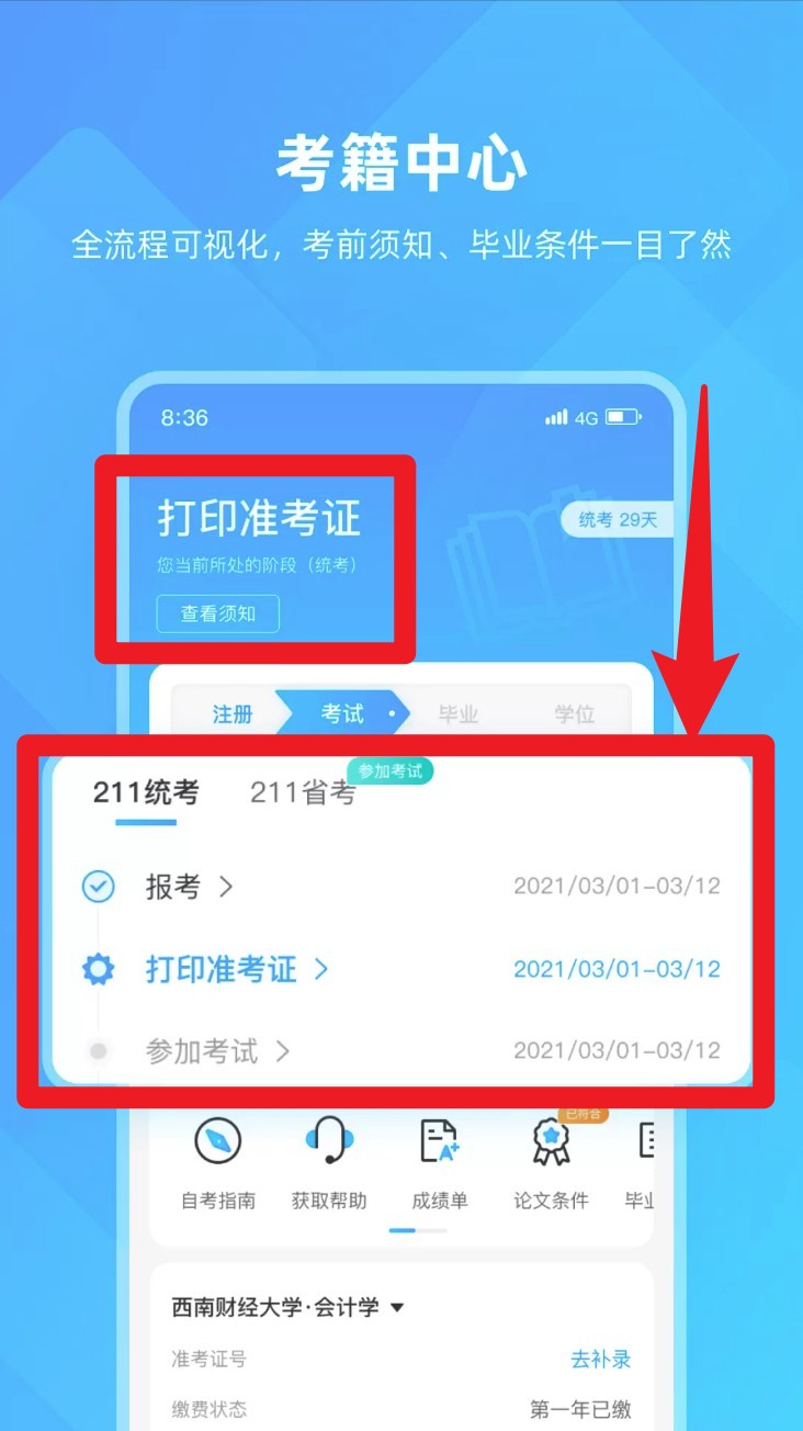 3. 在“考籍中心”内点击“打印准考证”,可查看当前报考状态与准考证下载时间段。