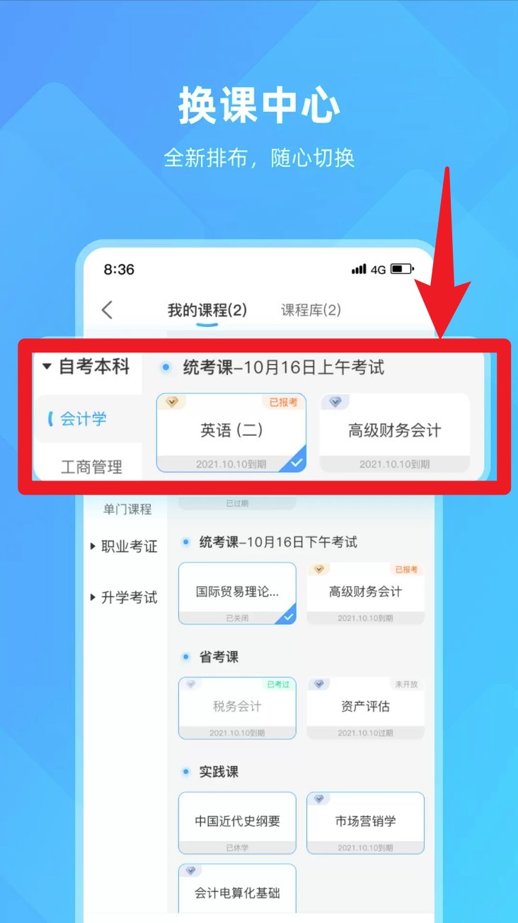 4. 进入“换课中心”后可切换所学课程模块,选择新课程后系统将自动调整学习安排。