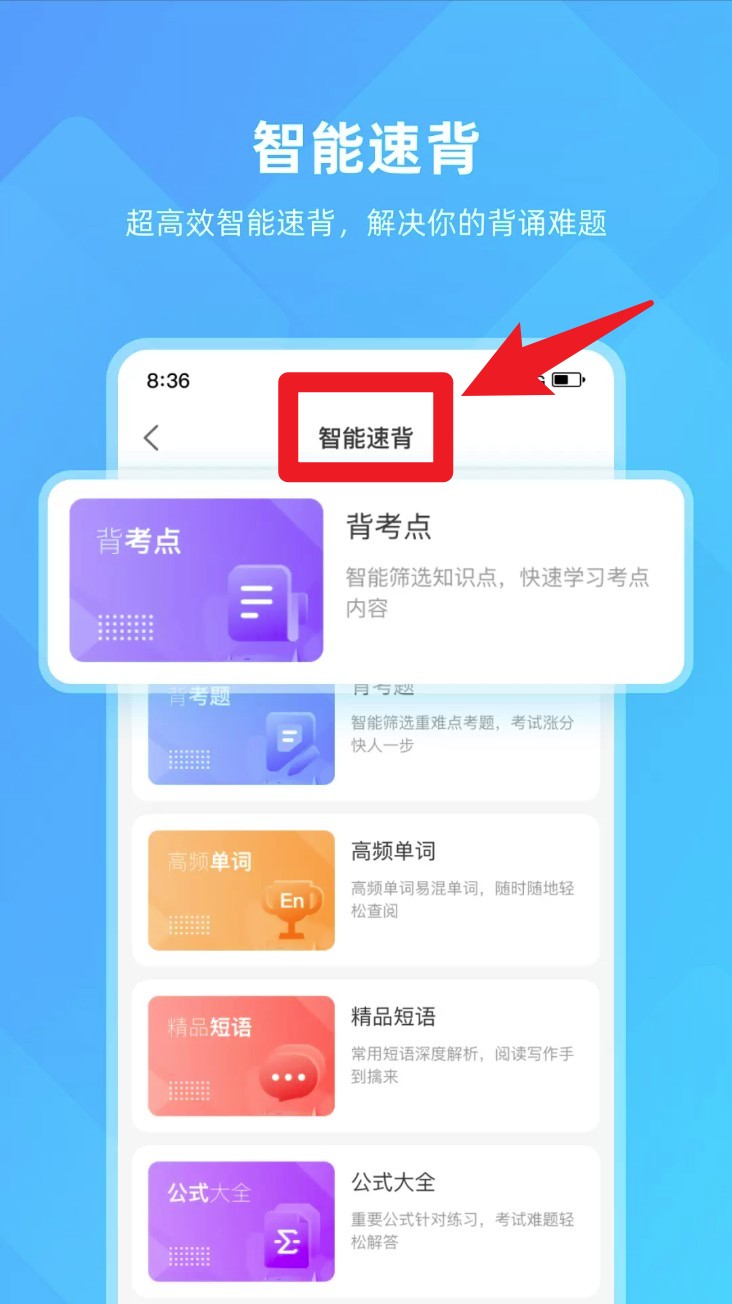 5. 点击“智能速背”可进入记忆训练模块,包含背考点、刷单词、公式练习等复习方式。