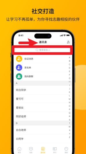 2、进入通讯录界面可查看联系人列表,并可通过搜索框快速查找联系人进行互动交流。