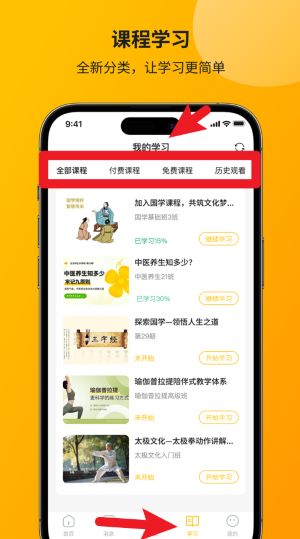 4、在“我的学习”中查看全部课程进度,支持分类查看已学课程与未开始课程,便于系统学习。