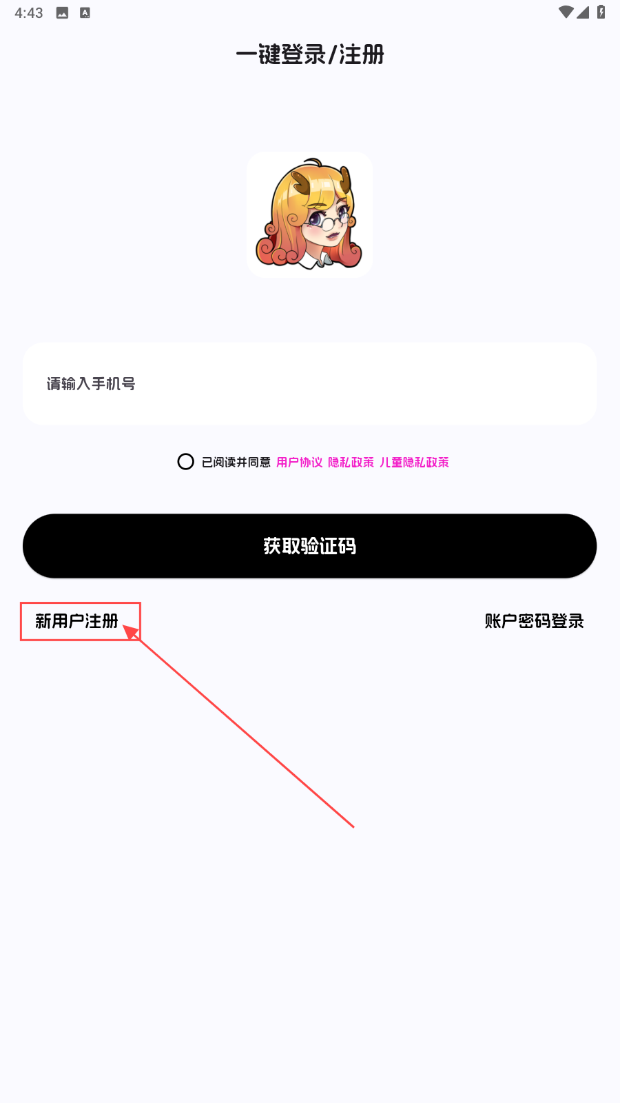 1、打开应用,点击【新用户注册】。