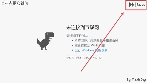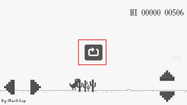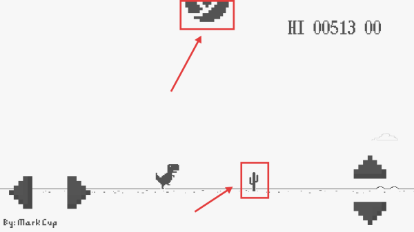 2、点击三角按键控制恐龙左右移动和跳跃俯身,需要躲避地面上的障碍物和空中的袭击。