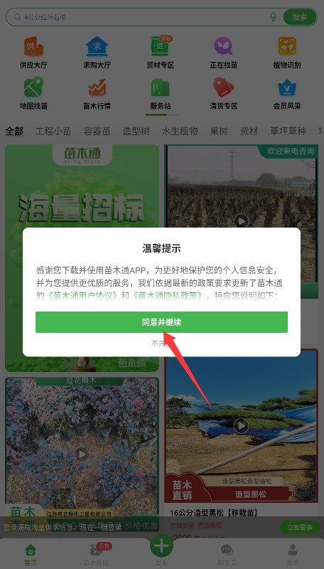 1、初次使用需阅读平台服务条款与隐私政策,确认后点击同意并继续进入应用。