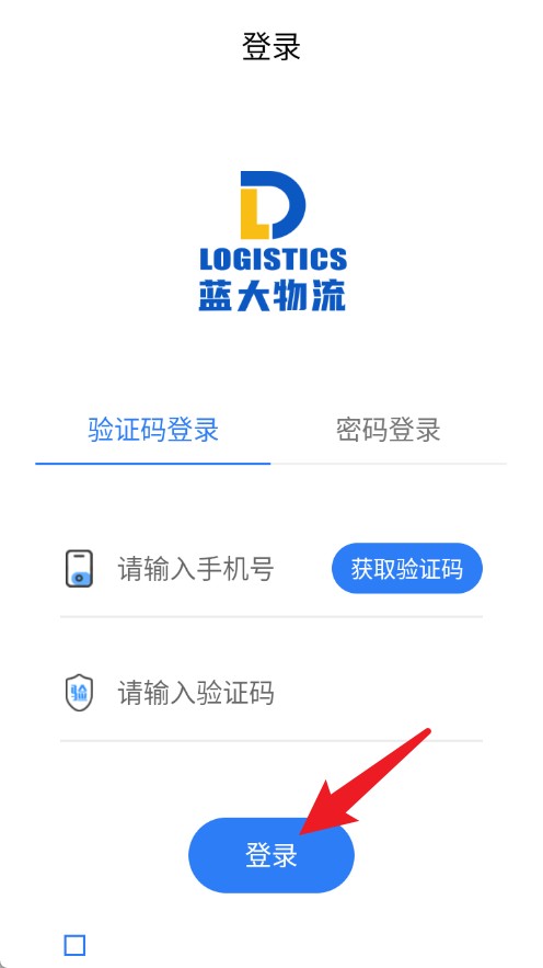 1、用户打开蓝大物流APP,选择验证码登录,输入手机号获取验证码后点击登录按钮完成登录。