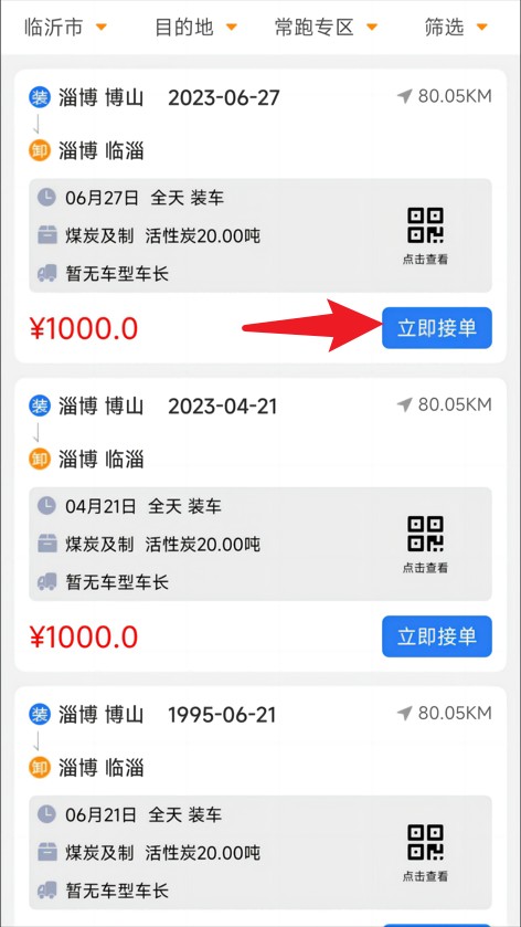 2、登录成功后进入订单列表页,查看货源详情并可点击“立即接单”按钮抢单操作。